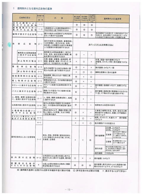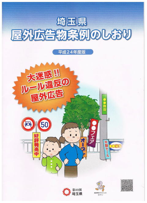埼玉県の屋外広告物条例のしおりのP13・P14を載せました。そこに自家広告物(P13)という項目が有り、次ページに建造物から独立した広告という項目が有ります。 広告を掲示する場合様々な制約、条件が有ります。その中に適用除外となるものが有ります。自家広告物といわれるものもその一つです。皆様のパソコンで皆様のお住まいの県、市のしおりをご覧ください。